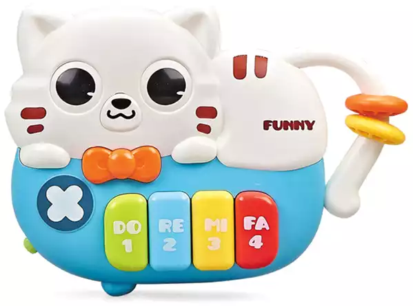 Эта яркая пластиковая фигурка в форме белого котика с галстуком-бабочкой и синими клавишами идеально подходит для детей. На игрушке расположены 4 цветные клавиши с нотами, удобная ручка в форме хвоста.