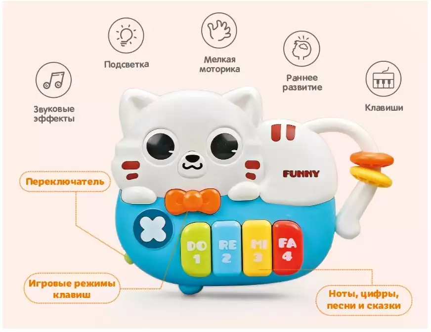 Эта игрушка способствует развитию слухового восприятия, мелкой моторики, сенсорных навыков и чувства ритма. Кроме того, она помогает освоить цифры и ноты, что делает её незаменимым инструментом для первых музыкальных экспериментов и творчества!